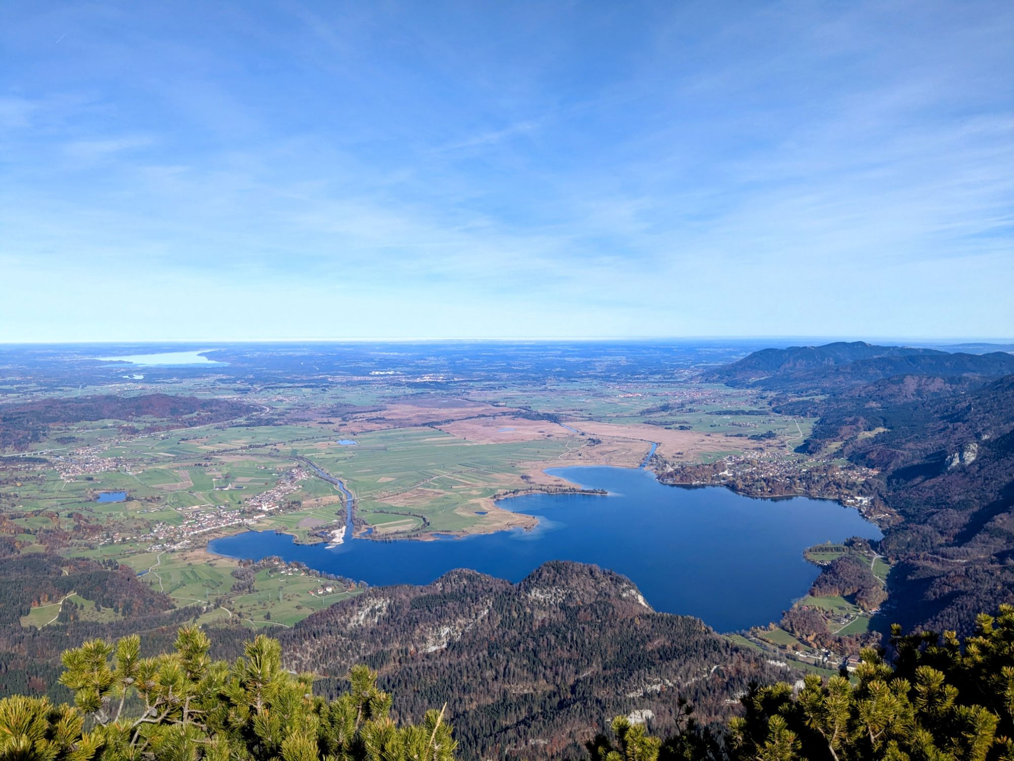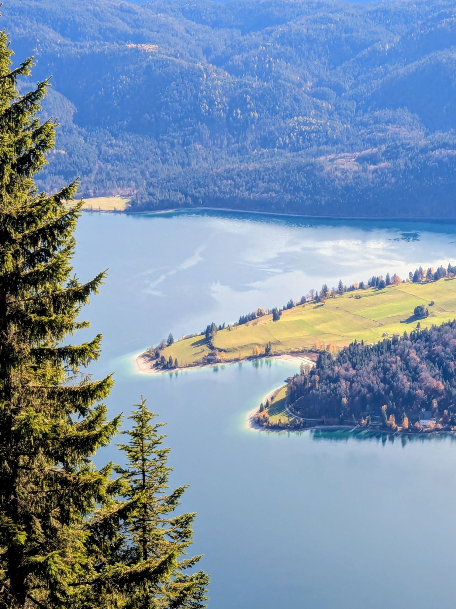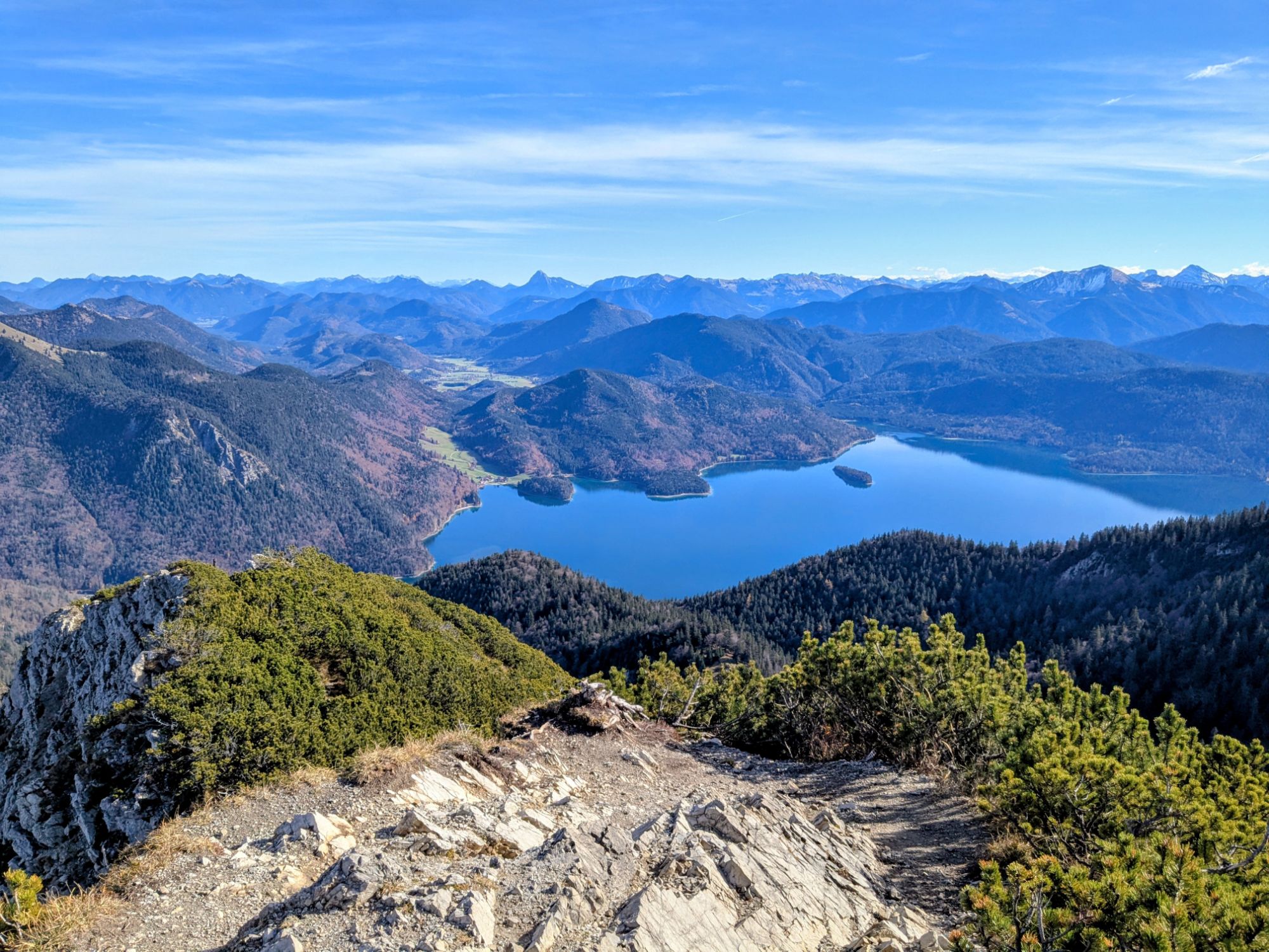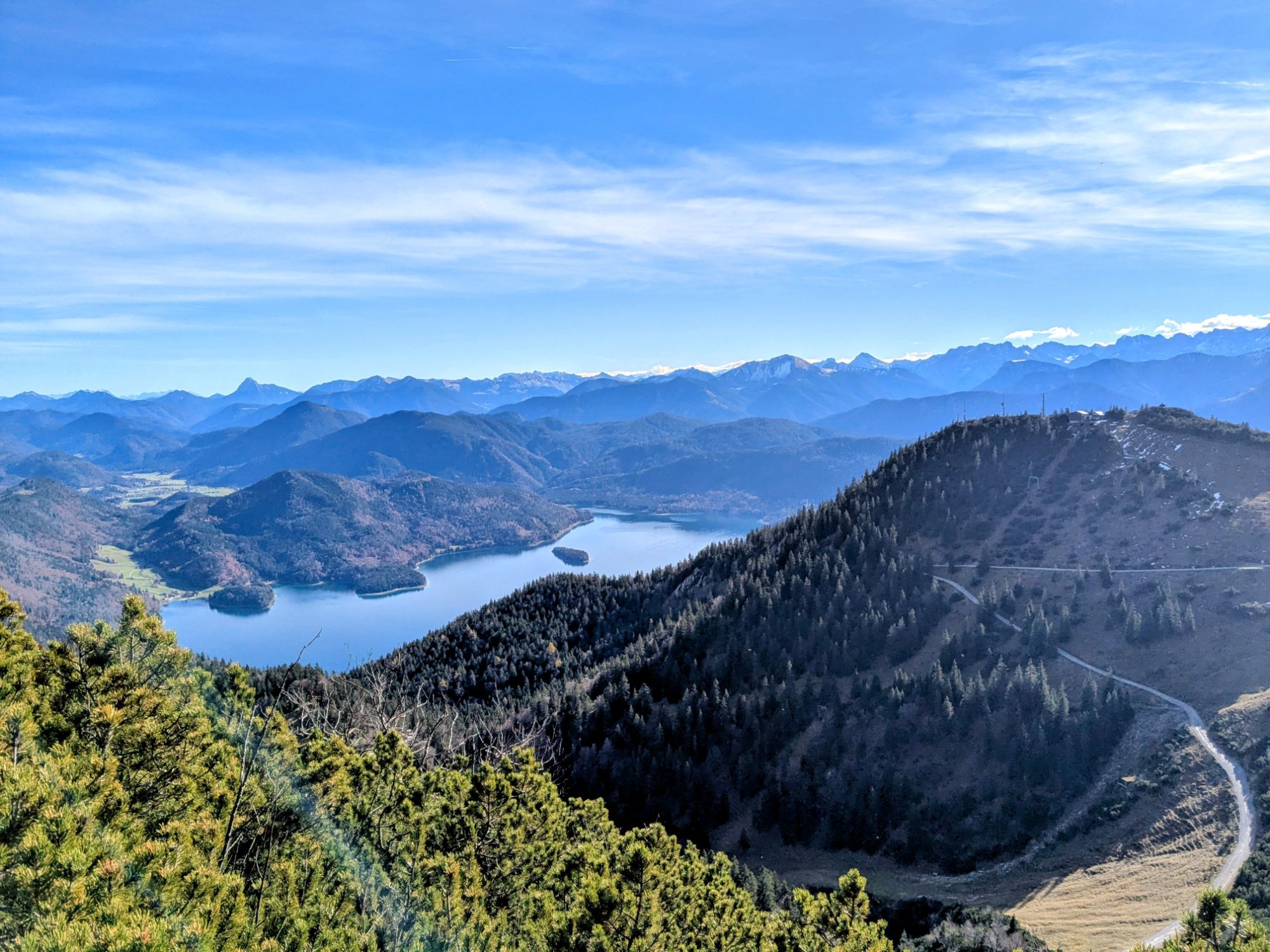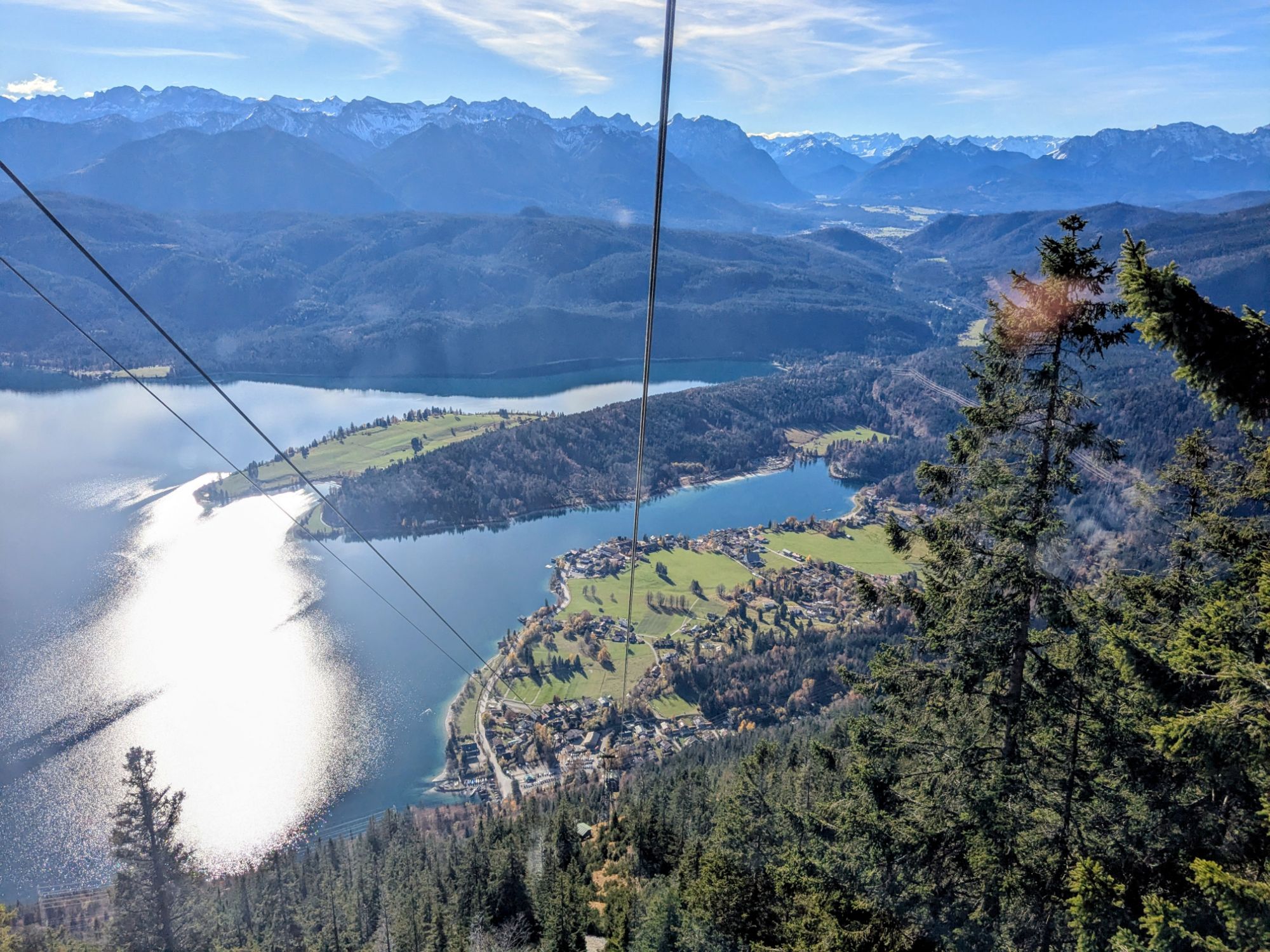 Der Herzogstand ist ein 1731m hoher Berg am Rande der Alpen, nicht weit von München, wo unser lieber Luggi wohnt. Bei einem spontanen Besuch entschieden wir uns also für einen kleinen Ausflug und fuhren die wilden Straßen des Passes zwischen Kochel- und Walchensee hinauf bis zur Herzogstandbahn, die uns in wenigen Minuten hinauf auf den Fahrenberg brachte. Die Sonne lachte und im Tal strahlte der Wald in den wildesten Herbstfarben.